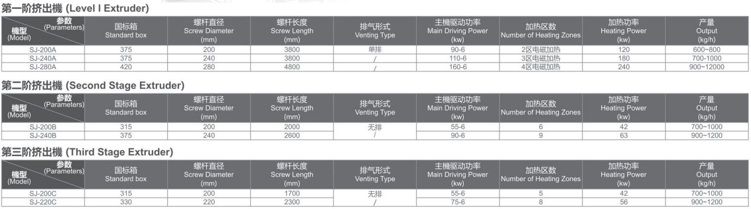 本公司生產的SJ系列水料擠出造粒機組,適用于破碎清洗薄膜(PE,PP)的擠出造粒,本機組第一階擠出機采用排氣設計,具有排氣和壓水排水功能,使造出來的顆粒更結實、光滑、純凈。